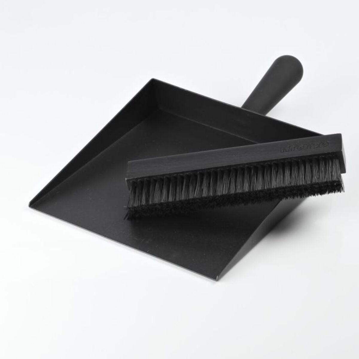 Dustpan and brush from Morso made of steel with rubber grips. The hand duster can be stored in the dustpan, easy and compact!