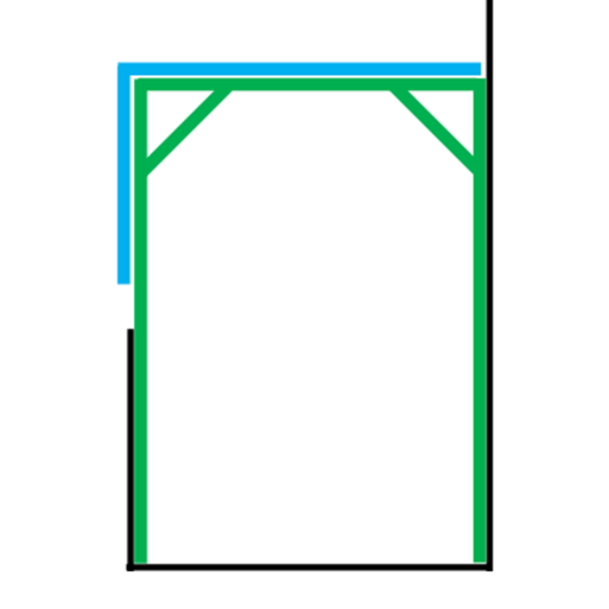 Attach the blind to the inside of 1 beam of your pergola and pull the blind to the other side. There you screw 2 hooks into the beam. Put the eyes of the blind around the hooks and pull the blind a bit tighter. Do not roll up the blind too tight as you may bend the aluminium tube in the blind. When you choose this solution it is handy that your pergola is not too high and that you can easily reach the top of the pergola with your hands to unhook and hook the blind. The roller blind is more sensitive to strong winds, so only close the blind when you are there and roll it up when you leave. As a permanent pergola this solution is not so suitable, but it can be a good solution for a small pergola on a balcony. For example, let's say you have a balcony 3 metres wide and 150cm deep as shown in the sketch alongside (the black lines). Then you can set up a small pergola there (the green lines), attach the roller blind (the blue line) to the side of the wall, roll it out, fold it over the other beam and pull it down where you fasten it. This way you have a "shade roof" and shade on the vertical side with only 1 roller blind.