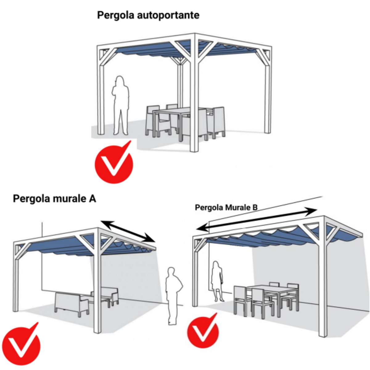 There are also two versions that exist of the lean to pergola,model A, where the fabric slides away from or towards the wall, and model B where the fabric slides parallel to the wall.